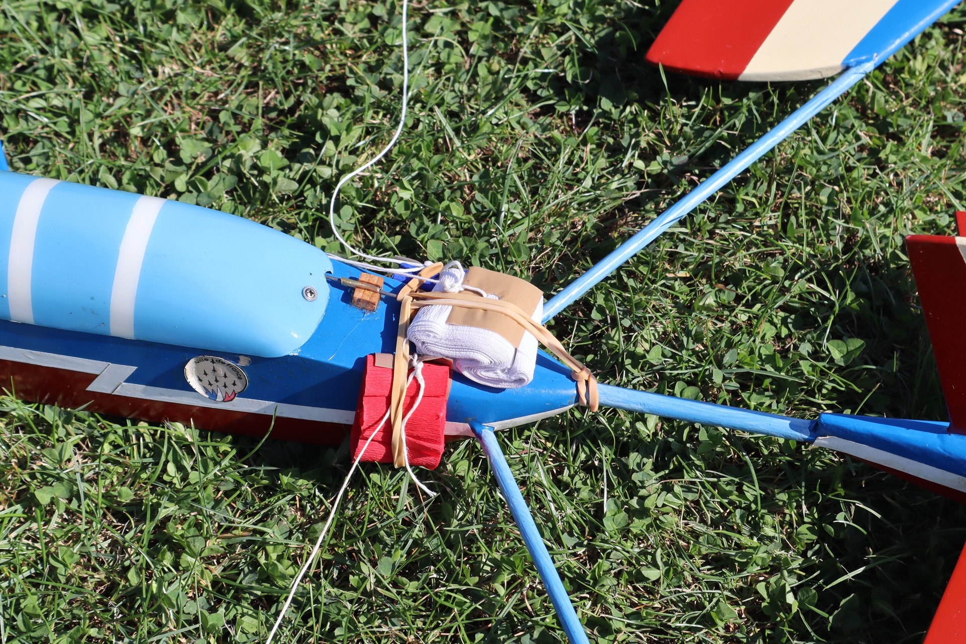 cette super vidéo ! Par rapport au plan : j’ai renforcé les supports de turbine (contre-plaqué 3 mm traversant la tuyère), le nez, ajouté 4 aimants pour le capot batterie, renforcé avec une baguette de Vector tous les collages en angle et ajusté quelques pièces. Si c’était à refaire : il faudrait avancer le capot batterie, le retrait de la batterie est difficile (il faut de tout petits doigts ou un outil). Je rajouterais également une deuxième traverse carbone pour plus de raideur. Sans batterie, l’avion prêt au vol pèse 504 g. En 3S 2200 mAh 70C, il vole parfaitement mais le rapport poussée/poids est inférieur à 1. En 4S 1800 mAh 100C, c’est une fusée qui grimpe à la verticale… Les deux batteries font autour de 190 g et permettent 4mn30 de vol soutenu, un peu plus si on n’a pas la main trop lourde sur les gaz, pour une fin de vol à 30% de charge batterie. La batterie ne chauffe quasiment pas. Un seul point particulier à signaler, la stabilisation. Lancer soi-même l’Einzpfeil est difficile, surtout s’il y a du vent. La bête est rapide et on n’a pas vraiment le temps de reprendre les commandes avant que l’avion ne fasse une embardée, potentiellement catastrophique. Il faut un complice pour décoller en sécurité, complice pas forcément toujours disponible. J’ai donc mis en place un récepteur stabilisé FRSky (en l’occurrence un SR10+) pour sécuriser le décollage et stabiliser l’avion en l’air (effets du vent). La position à rejoindre dans le mode « Automatic Level » est calée avec une assiette de +15°. Pour faire décoller l’avion, je sélectionne le mode « Automatic Level », mets les gaz à fond et lance l’Einzpfeil avec peu d’assiette positive, pas trop fort. La stabilisation en mode « Automatic Level » prend aussitôt le contrôle et amène l’avion à plat sur une trajectoire avec +15° d’assiette. Il suffit alors de sortir du mode « Auto Level » et revenir en mode « Stabilisation » standard pour commencer le vol. Sur la vidéo, on peut voir le résultat, avec pratiquement 50 km/h de vent… Le vol est tendu, avec de belles trajectoires et l’avion reste parfaitement contrôlable, à haute comme à basse vitesse (enfin… pas trop basse quand même !). Merci à toi pour le site et à l’auteur pour ce plan ! J’adore mon Einzpfeil ! Denis Chapuis 10 juin 2024 L’Association Bayeusaine de modélisme a réalisé cette Patrouille en partenariat avec la ville de Bayeux qui l'avait sollicitée pour une présentation en vol le 30 mai 2024 dans le cadre des animations liées au passage de la flamme olympique dans la ville. Nous avons échangé avec
